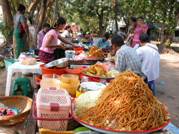 시내를 돌아다니다 보면 군것질 꺼리가 눈에 많이 띕니다. 각종 튀김류, 꼬치류, 족발, 과일류등이 있구요, 더우면 마실 냉차도 있답니다. 가격은 보통 70-100짯이니 부담이 전혀 없지요. * 찻집의 밀크 티 한잔에 75-150짯. 집에 따라 달라요. 차마시면 탁자에 놓은 중국식 발효차는 계속 무료입니다. 이 발효차는 어느 노점에나 있는데 뜨거운 보온병에 넣어 두어 피로를 푸는데 좋습니다. * 음료수 : 미얀마산 스타콜라, 크러샤(환타) 100짯. 쭈쭈 라고 부르는 비닐봉지에 담아줍니다. * 튀김류 : 찻집에서는 세모꼴 튀김만두를 팝니다. 모양은 인도식 싸모사와 같지만 맛은 중국집 군만두맛. 개당70짯. 찻집에서 파는 넙적한 부침개 100짯(비추입니다). 각종 작은 튀김류(5개 100짯) * 꼬치류 : 닭살코기나 내장을 이용합니다. 작은 것은 5개 100짯, 큰 것은 하나에 120짯 * 족발 : 길거리에서 국물을 끓여 놓고 족발꼬치를 담가 먹습니다. 하나 30짯. 강추! * 과일 : 수박,파인애플,파파야 등을 먹기 좋게 잘라서 비닐에 담아줍니다. 보통 100짯씩.