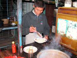 간단한 식사는 모두들 노점에서 해결합니다. 음식이 대부분 입맛에 맞으므로 걱정하실 것은 없구요, 많은 사람들 대부분 노점에서 잘 먹고 병 안걸립니다. * 모힝가 ( 메기탕 쌀국수) : 노점에서 작은그릇으로 보통 100-200짯. 약간 느끼하므로 고추넣기 강추 * 까욱셰 (비빔 쌀국수) : 여러 소스를 넣어 버무려 비벼줍니다. 여러 가지가 있으며 간짜장 맛 나는 것도 있고 카레맛 나는 것도 있습니다. 간짜장 맛 나는 것을 싯쳇까욱셰라고 부르더군요. 싼 곳은 100-200짯, 비싼 곳은 400짯 까지. * 밥과 반찬으로 먹기 : 밥은 1인당 100짯(무제한), 반찬은 종류에 따라 다릅니다. 보통 100-300짯. * 식당에서 파는 국수는 300-600짯까지 합니다. * 도시락으로 이용하시려면 시장에서 스티키 라이스를 사 보세요. 대나무통에다 밥을 한 것인데 파는 사람에 따라 맛이 다 다르지만 대체적으로 맛있고 쌉니다. * 양곤 슐레 파고다 서쪽 큰길 아침엔 양념뿌린 뜨거운 찰밥을 50짯에 팝니다. 무지 맛있고 달콤함.