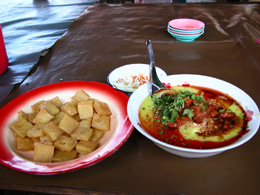 쉐양 시장에서 먹은 카레까욱셰(오른쪽) 150짯. 두부튀김 150짯. 맛있고 양 많음
