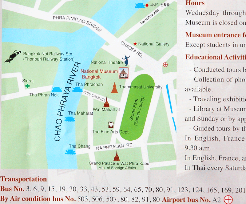 태국은 지도 서비스가 아주 잘 되는 곳입니다. 일단 시내 지도는 돈무앙 공항 나오시면서 살펴보시면 꼽혀 있구요, 없다면 입국장에 있는 관광안내 부스에서 구할 수 있습니다. 카오산에서 국립박물관 가는 길의 정부 관광청에서는 필요한 지도 모든 것을 구할 수 있지요.