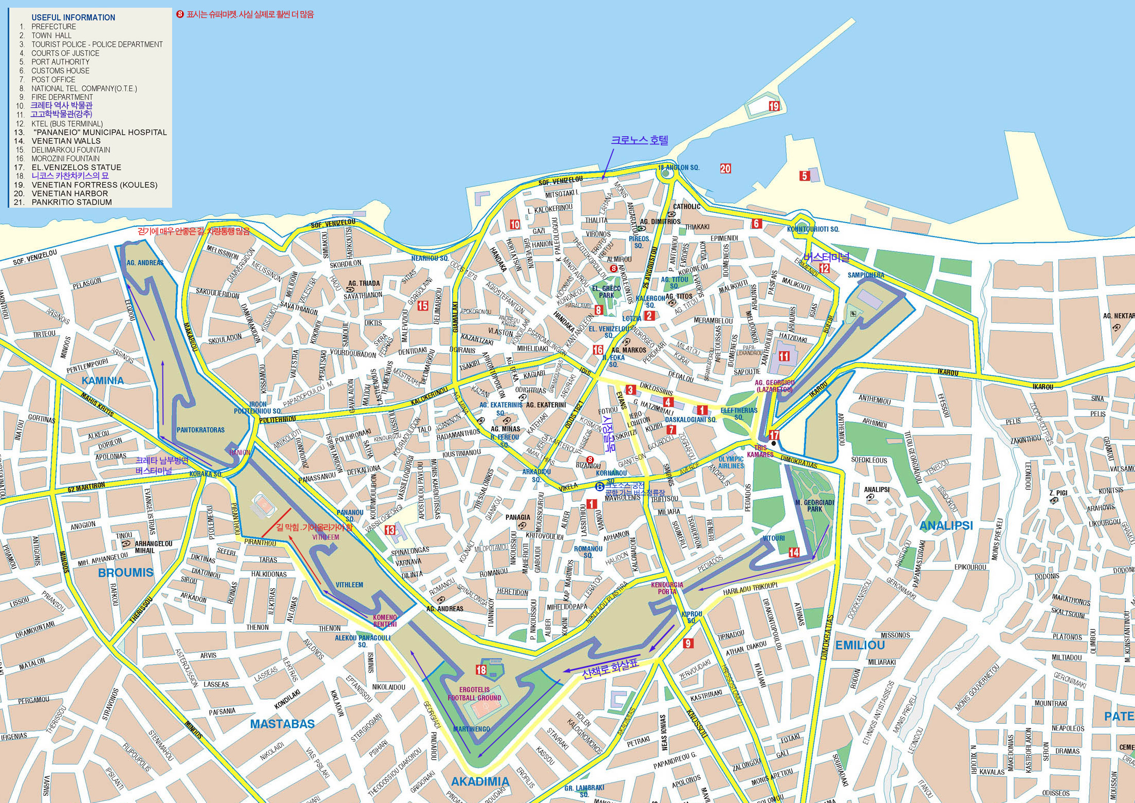 (1) µµ½Ã°£ À̵¿ À̶óŬ¸®¿Â ¹ö½ºÅ͹̳ÎÀº À§ Áöµµ¿¡ Ç¥½ÃµÇ¾î ÀÖ´Ù. ¹ö½ºÅ͹̳ÎÀº µÎ ±ºµ¥Àε¥ Áöµµ ¿À¸¥ÂÊ À§ÀÇ Å͹̳ÎÀº ·¹ÆÀ³ë, Çϳª¾Æ, ¾Æ±â¿À½º ´ÏÄݶó¿ì½º µî ÁÖ¿ä µµ½Ã¸¦ ¿Õº¹ÇÏ´Â ¹ö½º°¡ ´Ù´Ï¸ç Áöµµ ¿ÞÂÊ Áß°£, ¼ºº®¿¡ ºÙ¾î ÀÖ´Â Å͹̳ο¡¼´Â Å©·¹Å¸ ¼¶ ³²ºÎÁö¿ªÀ¸·Î °¡´Â ¹ö½º°¡ ´Ù´Ñ´Ù. ¹ö½ººñ´Â 1.5½Ã°£ °É¸®´Â ·¹ÆÀ³ë±îÁö 6.5À¯·ÎÀÌ´Ï ºñ½Ñ Æí. (2) ¹¬Àº °÷ ÇØº¯°¡¿¡ ÀÖ´Â Å©·Î³ë½º È£ÅÚÀÌ ´Ù³àº» °÷Áß °¡Àå °¡°Ý´ë ¼º´Éºñ°¡ ÁÁ¾Ò´Ù. ³ÃÀå°í,³¹æ,¿Â¼ö¸ñ¿å °¡´ÉÇÑ Æ®¸®Çà ·ëÀÌ 45À¯·Î¿´´Âµ¥ ºñ¼ö±â ÇÒÀΰ¡´Ù. ¿ì¸° 5ÀÏÀ» ¹¬¾ú´Âµ¥ ¸ÅÀϸÅÀÏ ½ÃÆ®¸¦ °¥¾Æ ÁÖ°í û¼Òµµ ÇØ ÁÖ´Â ÁøÂ¥ È£ÅÚÀÌ´Ù. ¾ÆÄ§ ºÒÆ÷ÇÔ. È£ÅÚ ¹æ¿¡ ºÙ¾î ÀÖ´Â ¿ä±ÝÇ¥·Î ºÁ¼´Â ¼º¼ö±â¿£ 65À¯·Î Á¤µµ. ÇÏÁö¸¸ ¼º¼ö±â(7-9¿ù)¿£ ¹æÀÌ ¾ø´Ù°í º¸¸é µÈ´Ù. (3) ¸Ô°í »ì±â ½Ä´ç¿£ °¡º¸Áö ¾Ê¾ÒÁö¸¸ À§ ÁöµµÀÇ ½ÃÀå ¾È¿¡ ÀÖ´Â ½´ÆÛ¿¡¼ »ýÇÊǰ°ú Ä¡Áî, »§, ¼Ò½ÃÁö, ±×¸®°í ƯÀÌÇϰԵµ Á¶¸®µÈ À½½ÄÀ» ÆÈ°í ÀÖ¾î¼ Å©·¹Å¸ ÇöÁö À½½ÄÀ» ¸Àº¼ ¼ö ÀÖ´Â ±âȸ°¡ µÆ´Ù. ½Ä´ç¿¡¼ 7À¯·Î Á¤µµ ÇÏ´Â »ý¼± ¿ä¸®°¡ À̰÷Àº 3.5À¯·Î, ¹«»çÄ«(°í±â ÆÄÀÌ)°¡ 4À¯·Î Á¤µµ. Åë´ßÀº Å« °ÍÀÌ 7À¯·Î. (4) ½Ã³» ±³Åë Å©³ë¼Ò½º ±ÃÀüÀ¸·Î °¡·Á¸é À§ Áöµµ Áß´Ü¿¡ Ç¥½ÃµÈ ¹ö½ºÁ¤·ùÀå¿¡¼ 2¹ø ¹ö½º¸¦ Ÿ¸é µÈ´Ù.(1.1À¯·Î) ±×¸®°í °øÇ×À¸·Î °¡´Â ¹ö½º´Â 1¹ø ¹ö½º. ¿ª½Ã °°Àº Á¤·ùÀå¿¡¼ ź´Ù. ¼ºº®À¸·Î µÑ·¯ÃÄÁø ±¸½Ã°¡Áö´Â °É¾î¼ À̵¿ÇÒ ¼ö ÀÖ´Ù. (5) Á¤º¸ Áöµµ ±¸Çϱâ À̶óŬ¸®¿Â °í°íÇÐ ¹Ú¹°°ü ¸ÂÀº ÆíÀÇ °ü±¤¾È³»¼Ò¿¡¼ ¿©·¯ Áöµµ¿Í Å©·¹Å¸ °ü±¤ Á¤º¸¸¦ ±¸ÇÒ ¼ö ÀÖ´Ù